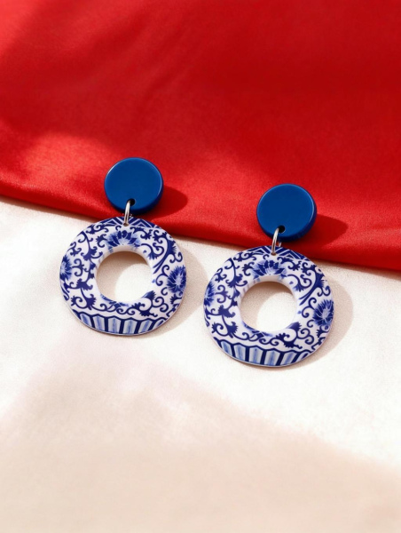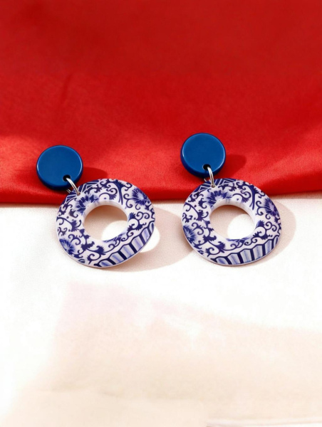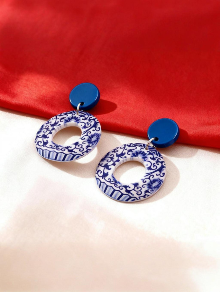 The elegant blue-and-white color palette faithfully reproduces the iconic tones of porcelain. Made from eco-friendly resin, these earrings mimic the smooth, glazed texture of ceramic while remaining lightweight and skin-friendly. Each earring weighs just 7.1g, with the main hoop measuring 3.5 cm in diameter and a total length of 5.5 cm—perfectly sized for everyday wear without any discomfort.