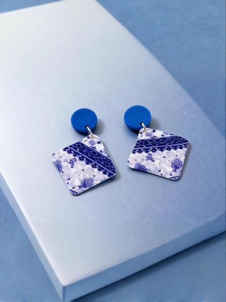 Chinese Spring and Summer New Blue-and-White Square Pendant Earrings -| Geometric Outline . Classic Porcelain Patterns, a Cultural Easter Egg for Daily Wear