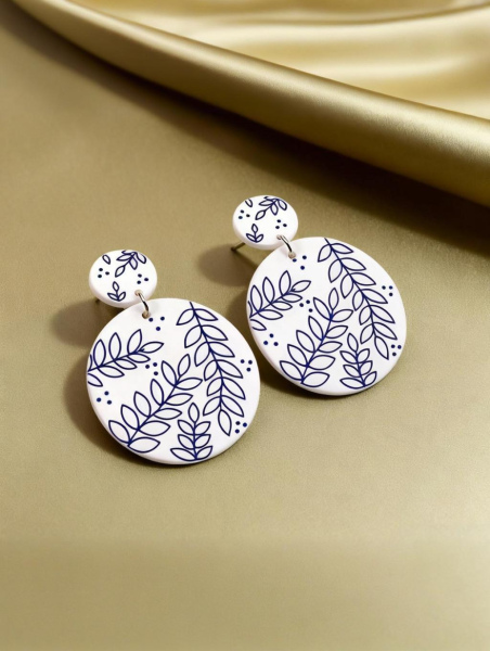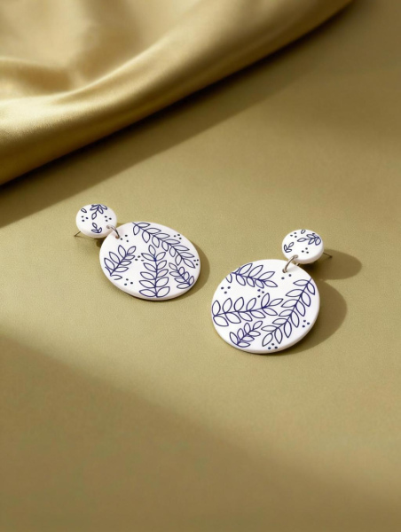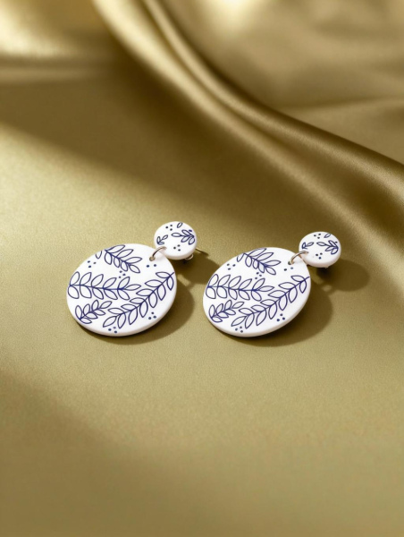 The inspiration draws from traditional Chinese blue-and-white porcelain, featuring classic blue-and-white tones and hand-drawn leaf patterns. Blue-and-white porcelain is a quintessential symbol of Chinese aesthetics, with porcelain as the base and blue pigments for painting, carrying a thousand years of craftsmanship heritage. The leaf patterns, rooted in Chinese culture, symbolize vitality and abundance, signifying thriving life and enduring good fortune, infusing the earrings with a unique Eastern charm through traditional elements.