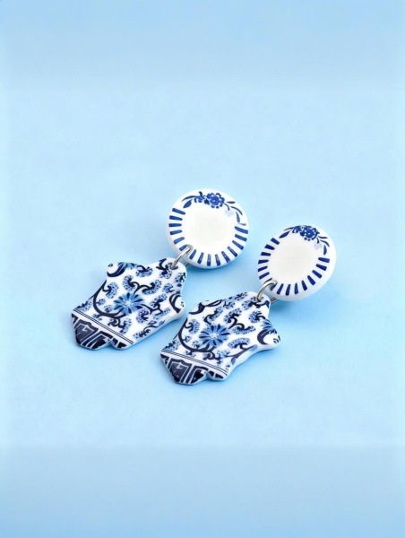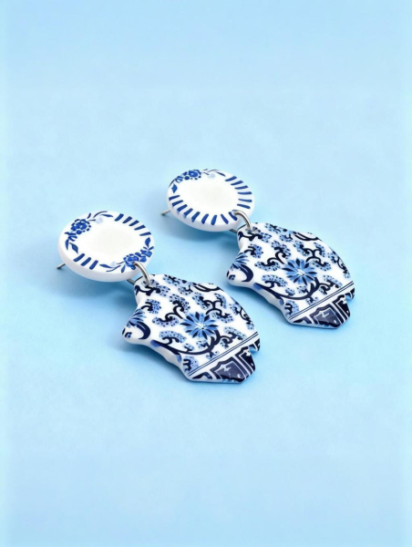 Drawing from the 2025 international fashion magazine trend of “cultural fusion,” these earrings mimic a porcelain vase shape with classic landscape and vine patterns. Originating from Tang and Song dynasty ceramics, these motifs symbolize nature and harmony, chosen to infuse tradition with fresh appeal for a standout spring/summer accessory.
