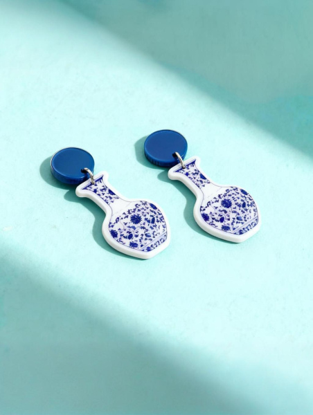 The fusion of vintage and innovation sets the prevailing tone. These earrings draw inspiration from a deep exploration of traditional Chinese blue-and-white porcelain art. Our focus rests on the classic porcelain vase—its elegant silhouette, refined by the passage of time, and the intricate floral patterns delicately traced on its surface, embodying the timeless aesthetic charm of the East.