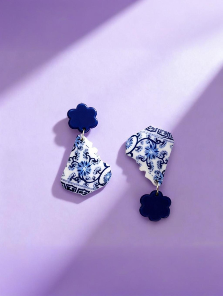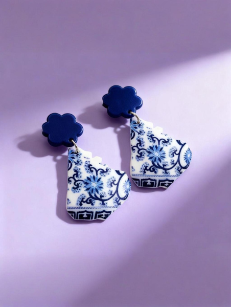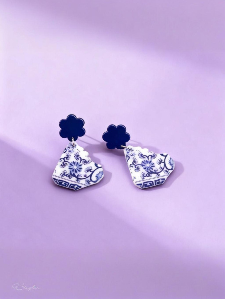 Embracing the 2025 "cultural deconstruction" fashion trend, these earrings reimagine Chinese blue-and-white porcelain vases and traditional six-petal flower motifs with a bold cross-cultural twist. The fan-shaped silhouette encapsulates intricate landscape and intertwined vine patterns, paired with six-petal flower studs that echo the Eastern "blossoming fortune" aesthetic. Transforming ancestral porcelain artistry into a versatile symbol for dancing at festivals or commuting in style, these earrings cure "forgettable outfits" with unforgettable cultural flair.