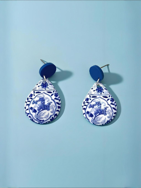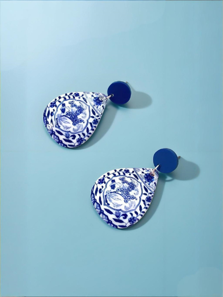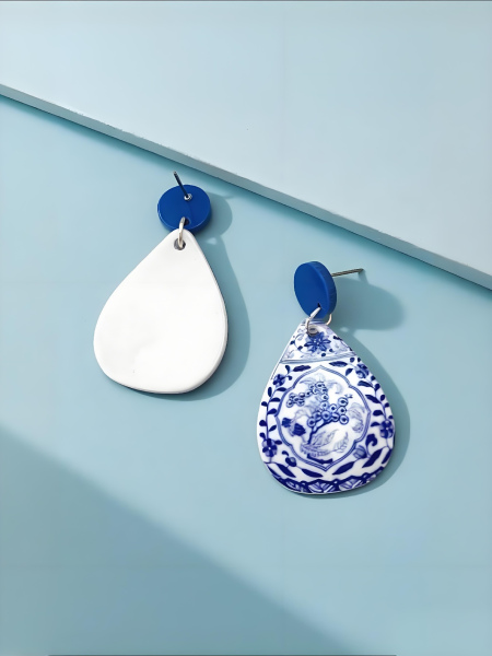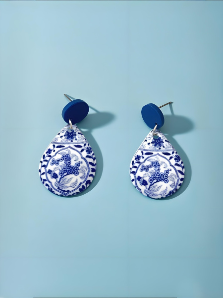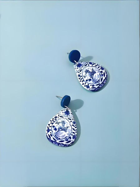 Inspired by the classic "teardrop" shape of Chinese blue-and-white porcelain, these earrings condense the intricate landscape and intertwined vine patterns of porcelain vases into a delicate teardrop silhouette. Blue-and-white porcelain, an icon of Eastern aesthetics, once admired solely on ceramics, now transforms into a scenic adornment at the ear. Aligned with the 2025 global fashion trend of "cultural fusion," these earrings infuse traditional elements into outfits, creating a unique and memorable style statement.