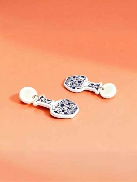 The fusion of vintage and innovation sets the prevailing tone. These earrings draw inspiration from a deep exploration of traditional Chinese blue-and-white porcelain art. Our focus rests on the classic porcelain vase—its elegant silhouette, refined by the passage of time, and the intricate floral patterns delicately traced on its surface, embodying the timeless aesthetic charm of the East.